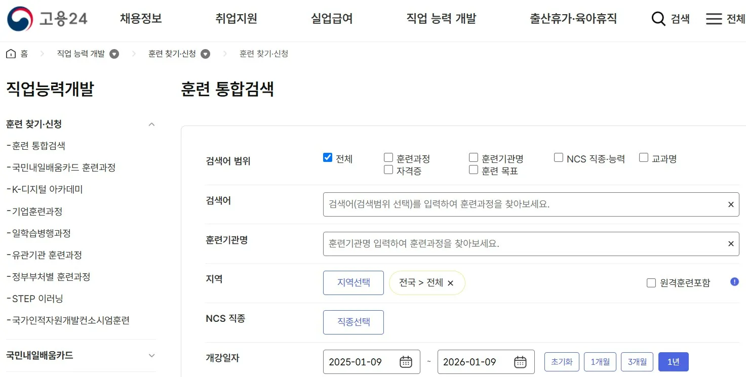 [고용24 훈련 통합 검색 화면]