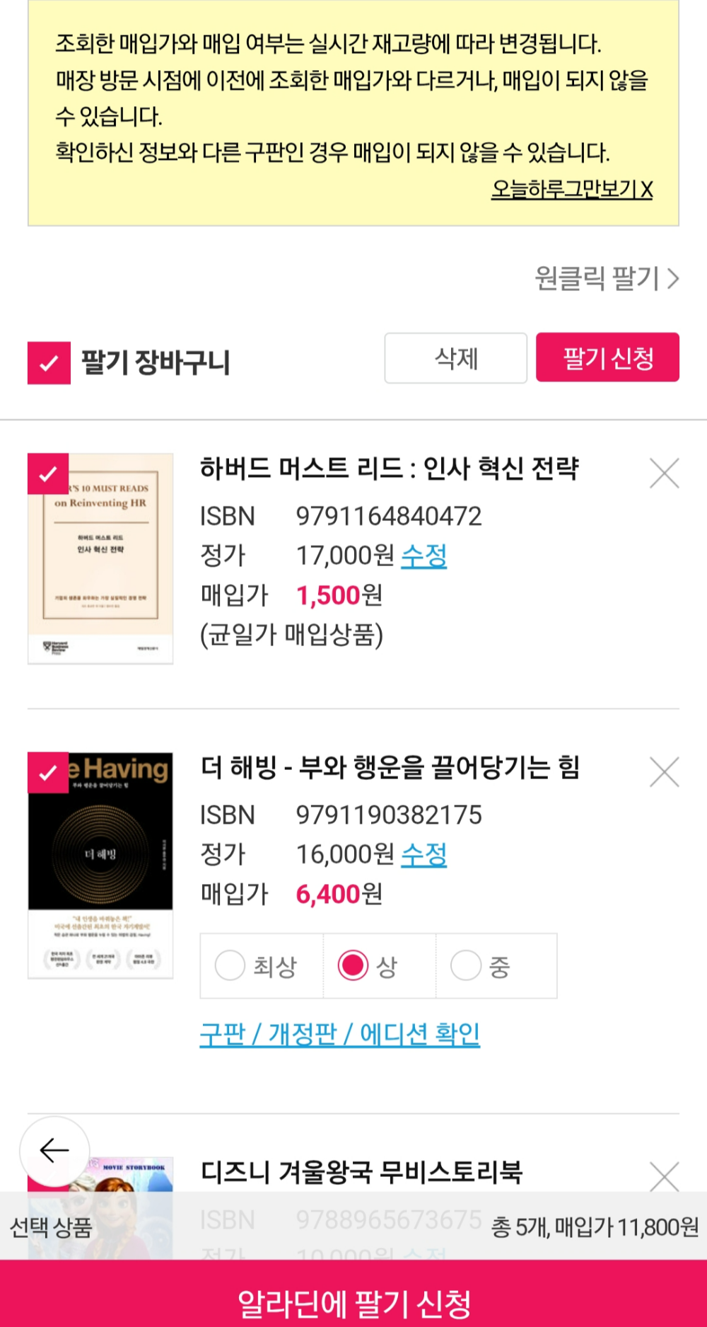 온라인으로 판매 신청을 할 수 있지만 온라인으로 판매를 하면 택배로 한 권씩 보내야 하는 불편함이 있고 내 책이 팔릴 수 있을지 여부도 알 수 없기 때문에 오프라인 알라딘 서점으로 판매가능한 책을 모두 들고 갑니다.