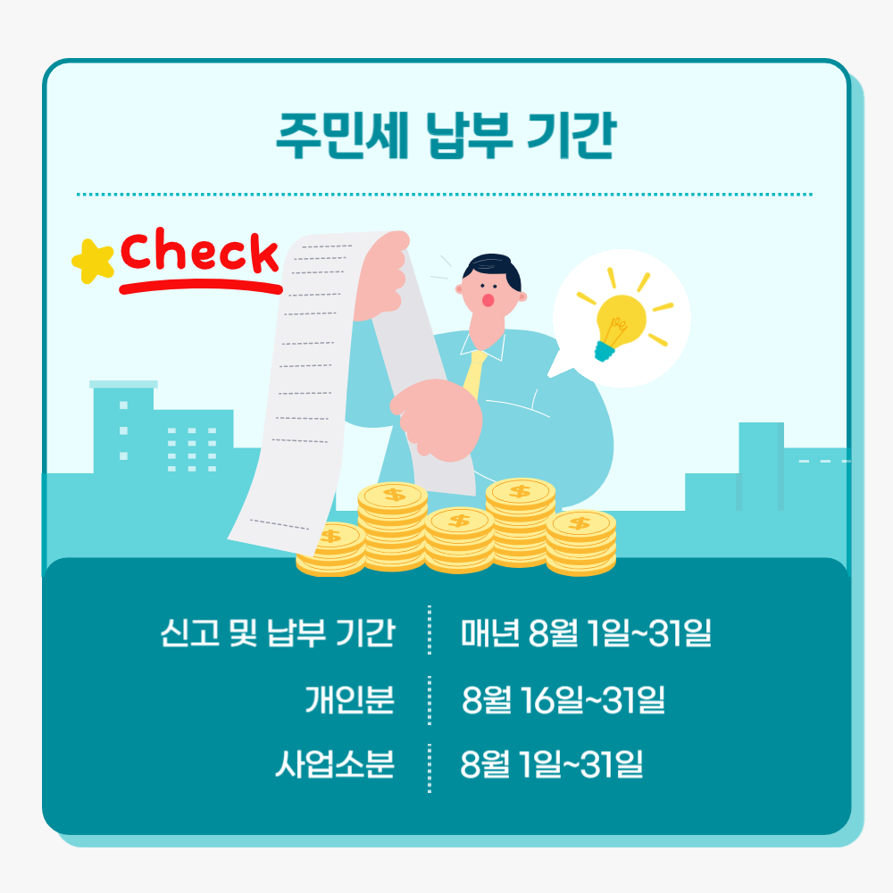 따라서 8월은 주민세 개인분 납부의 핵심 시기로, 반드시 8월 16일~9월 1일 사이에 처리해야 합니다.