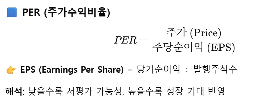 | PER | 주가 ÷ 순이익(주당). 낮으면 저평가 가능, 높은 경우 성장 기대 반영. |