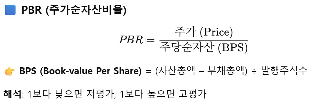 | PBR | 주가 ÷ 장부가치(주당 순자산). 1보다 낮으면 저평가. |