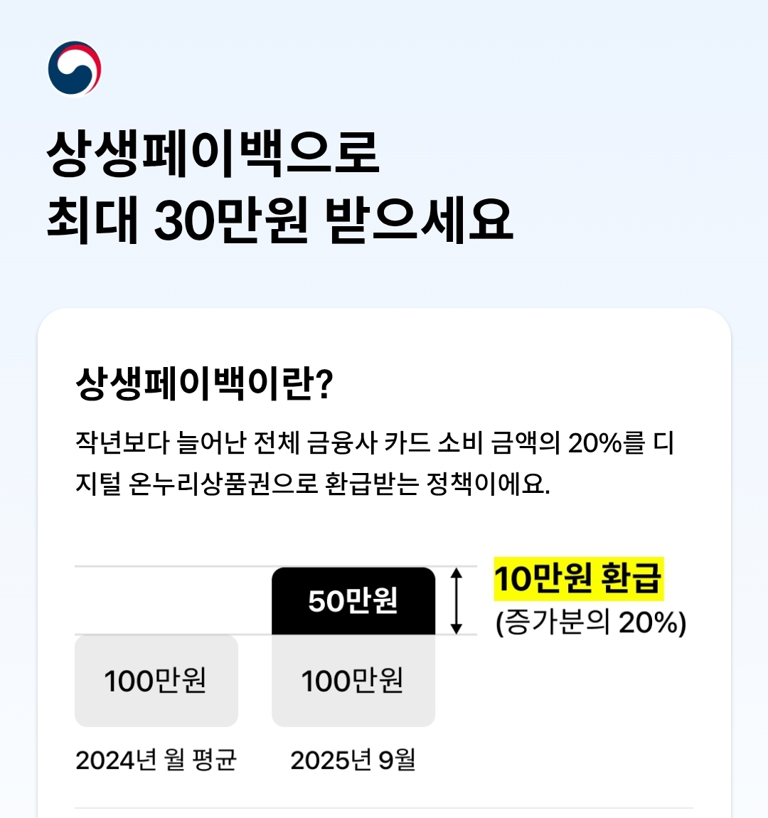 - 카드 사용액 증가분의 20%를 상생페이백환급으로 지급 (최대 30만 원)