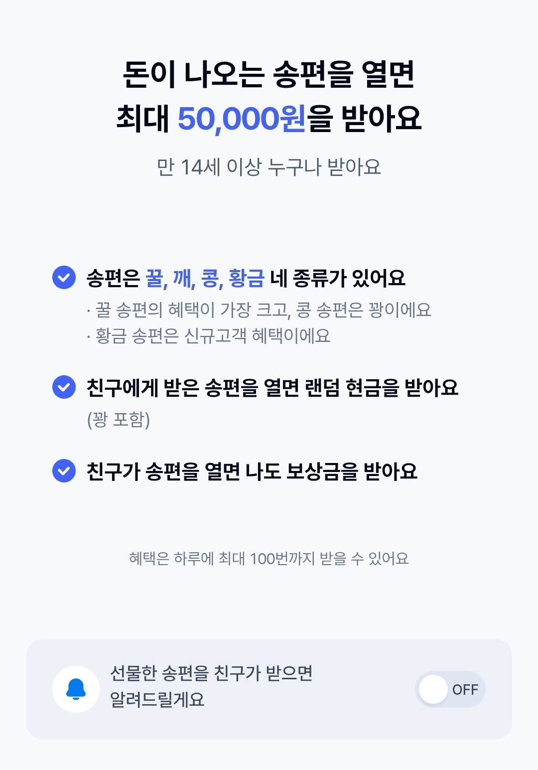 송편을 열면 랜덤 현금 리워드를 받을 수 있는데,