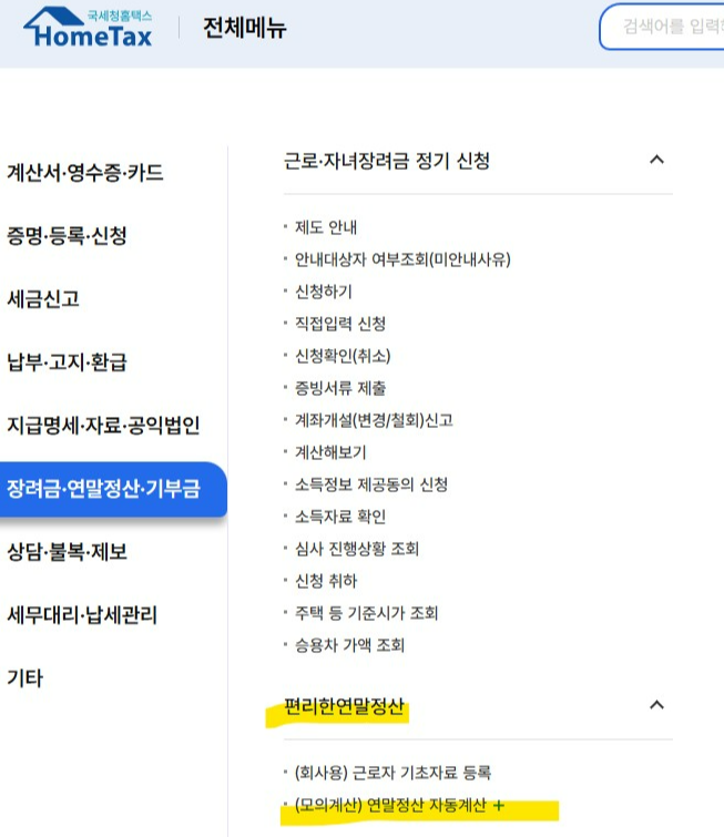 홈택스 -> 장려금연말정산기부금-> 편리한 연말정산 -> 모의계산