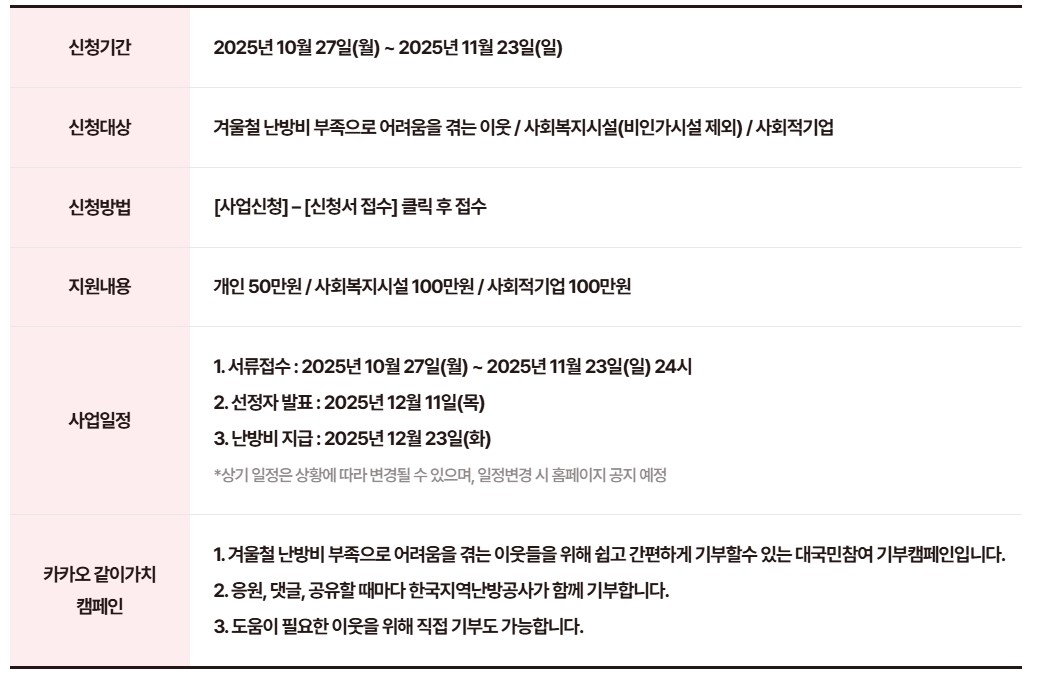 • 목적: 난방비 마련이 어려운 개인 가구, 사회복지시설, 사회적기업 등에 현금성 지원을 통해 따뜻한 겨울을 보내도록 도움