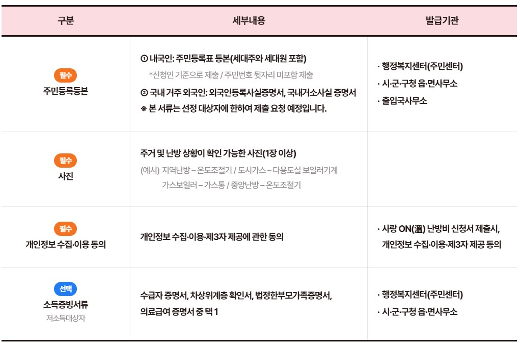 - 개인 가구용 필수 서류: 주민등록등본(세대주 포함), 난방 상태가 보이는 사진(보일러, 온도조절기 등), 개인정보 수집·이용 동의서.