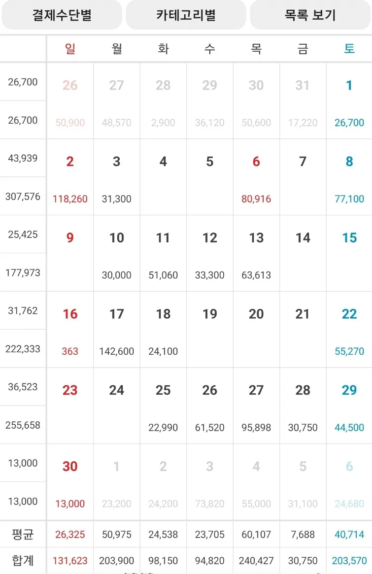차트는 결제수단별, 요일별, 시간대별, 내역별 다양하게 그래프로 시각적으로 확인 할 수 있습니다.