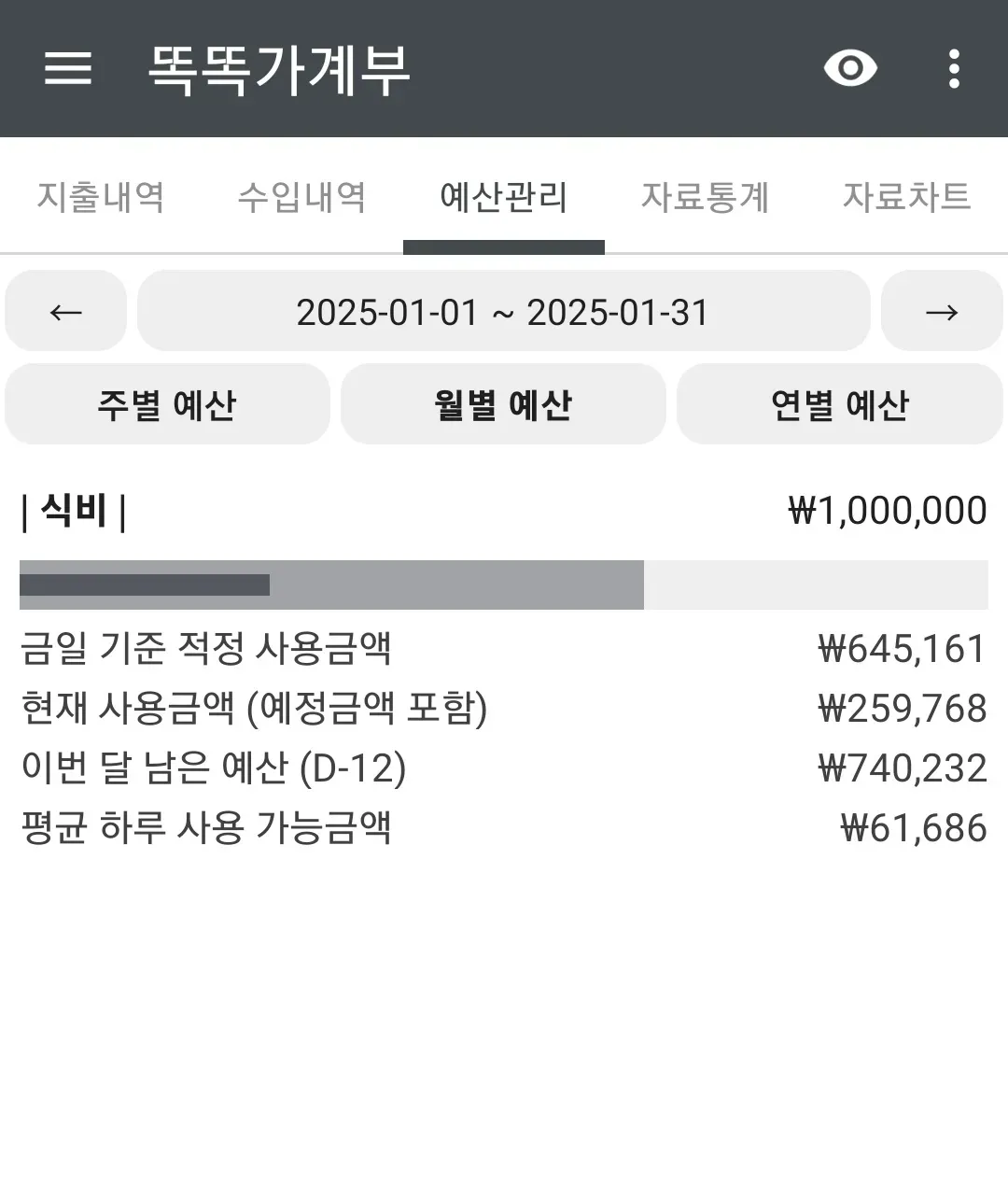 예를들어 한달에 식비를 100만원을 사용목표로 정해 놓으면 하루에 얼마를 써야 하는지 이번달 남은 예산과 앞으로 하루에 얼마씩 쓸 수 있는지등을 계산해서 보여줍니다.