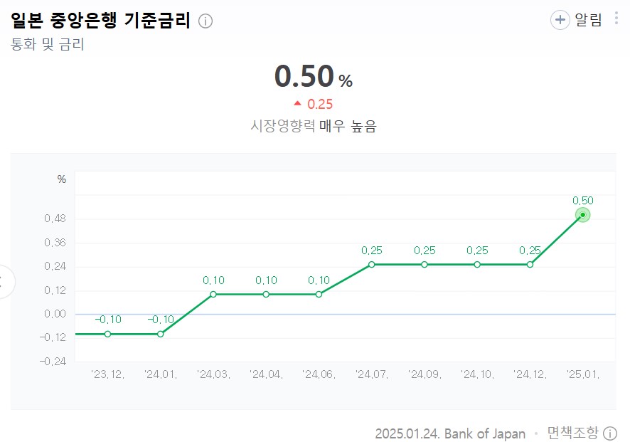 일본은행이 1월24일 기준금리를 0.25%에서 0.5%로 올리면서 일본 금리는 2008년 10월 이후 17년만에 최고 수준으로 높아졌습니다. 이번 금리 인상은 엔화 강세를 유도하고 외환 시장의 변동성을 완화하려는 의도로 보입니다.