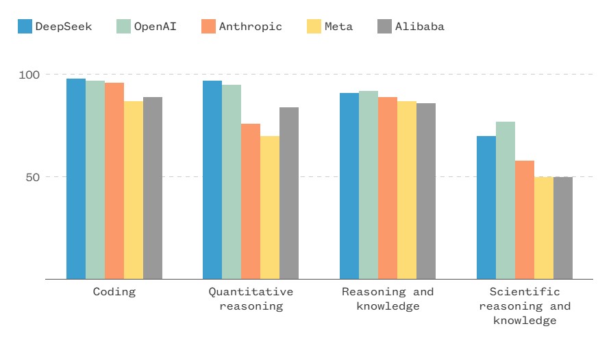 여기서 핵심은 미국이 중국으로 엔비디아 반도체 칩 수출을 규제하고 있는 상황에서 엔비디아 칩 없이 저가형 반도체를 이용해 챗GPT와 유사이상의 성능을 내는 AI를 출시했다는 점입니다.