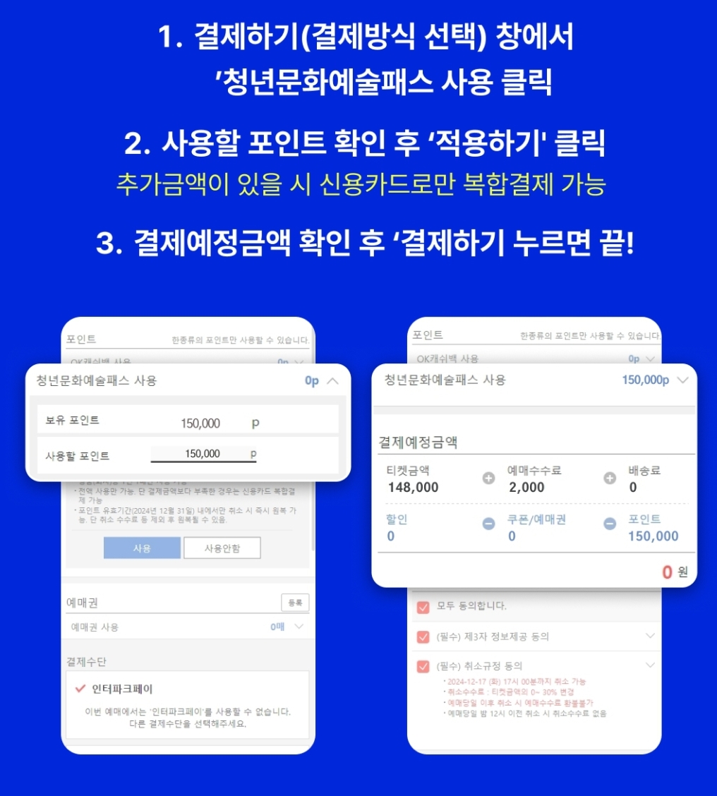 - 인터파크티켓, 예스24티켓에서 공연·전시 예매 시 포인트 형태로 적용됩니다.