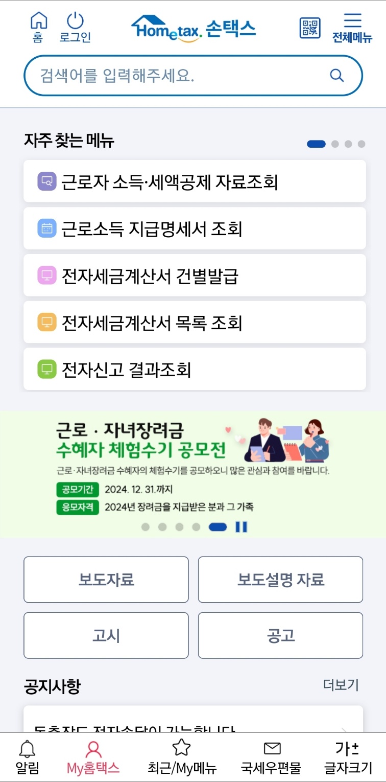 구글 플레이스토어나 애플스토어에서 "손택스" 또는 "국세청홈택스"로 검색하면 어플을 다운받을 수 있습니다.