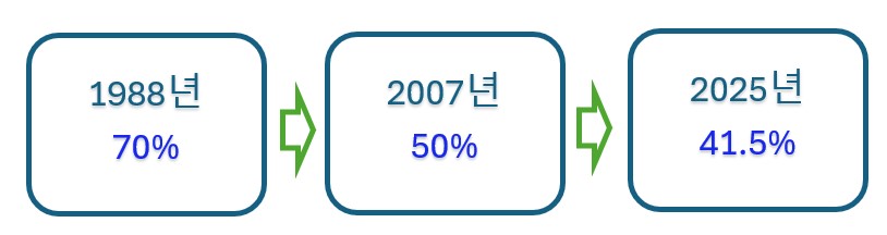 1988년 국민연금 도입 초기 소득대체율은 70%로 설정되었으나, IMF 외환위기 이후 재정 안정성을 고려해 차례로 낮아졌습니다. 2007년에는 50%로 낮춰졌고, 2009년에는 매년 0.5%씩 줄여 2028년에는 40%로 설정될 예정이었습니다. 2025년기준으로 소득대체율은 41.5%입니다.