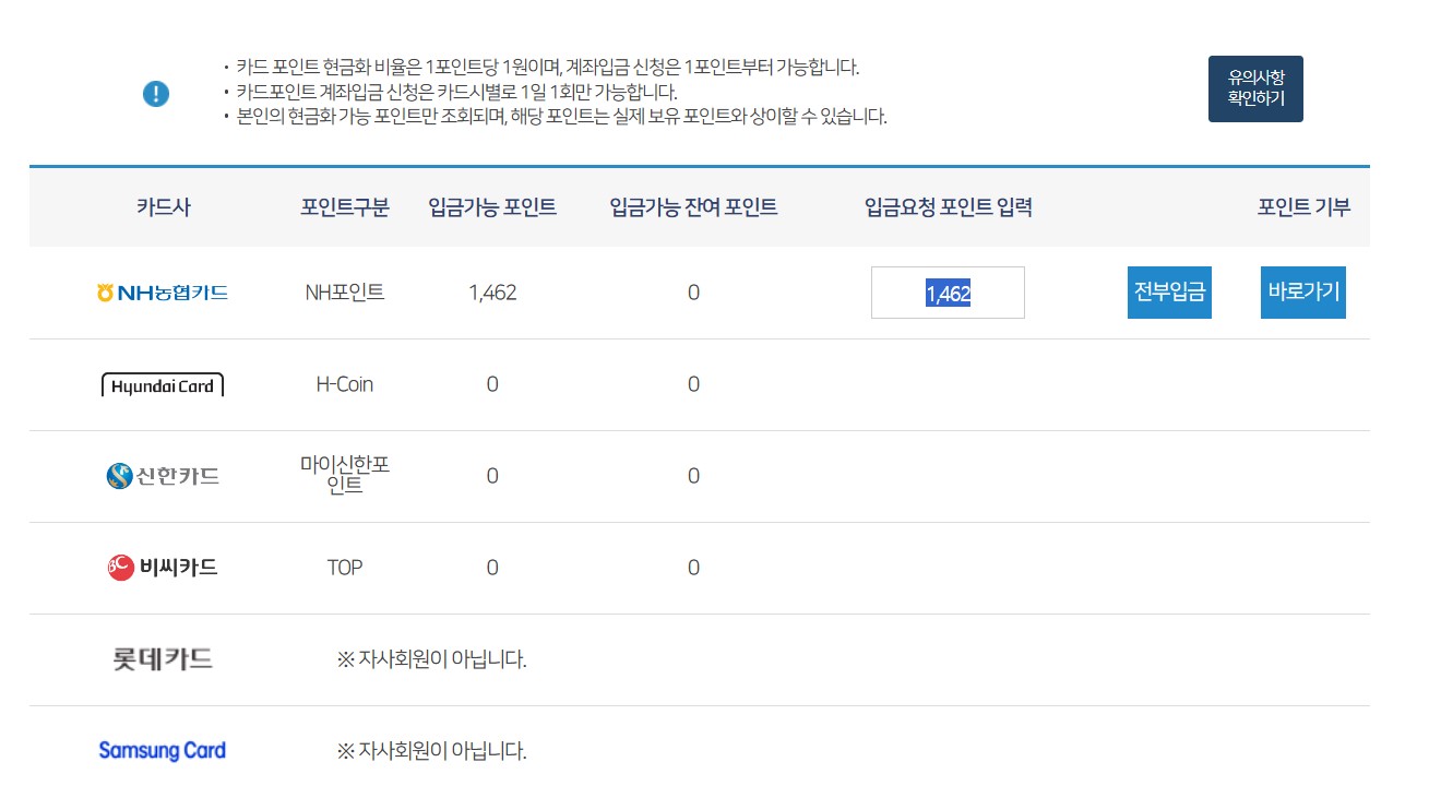 - 계좌입금 최소 포인트 기준: 카드사별로 다르므로 확인 필수