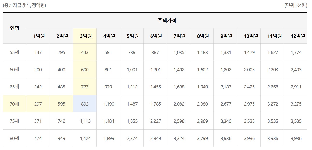 6. 주택연금으로 받을 수 있는 연금액 예시 (70세, 3억 원 주택 기준)