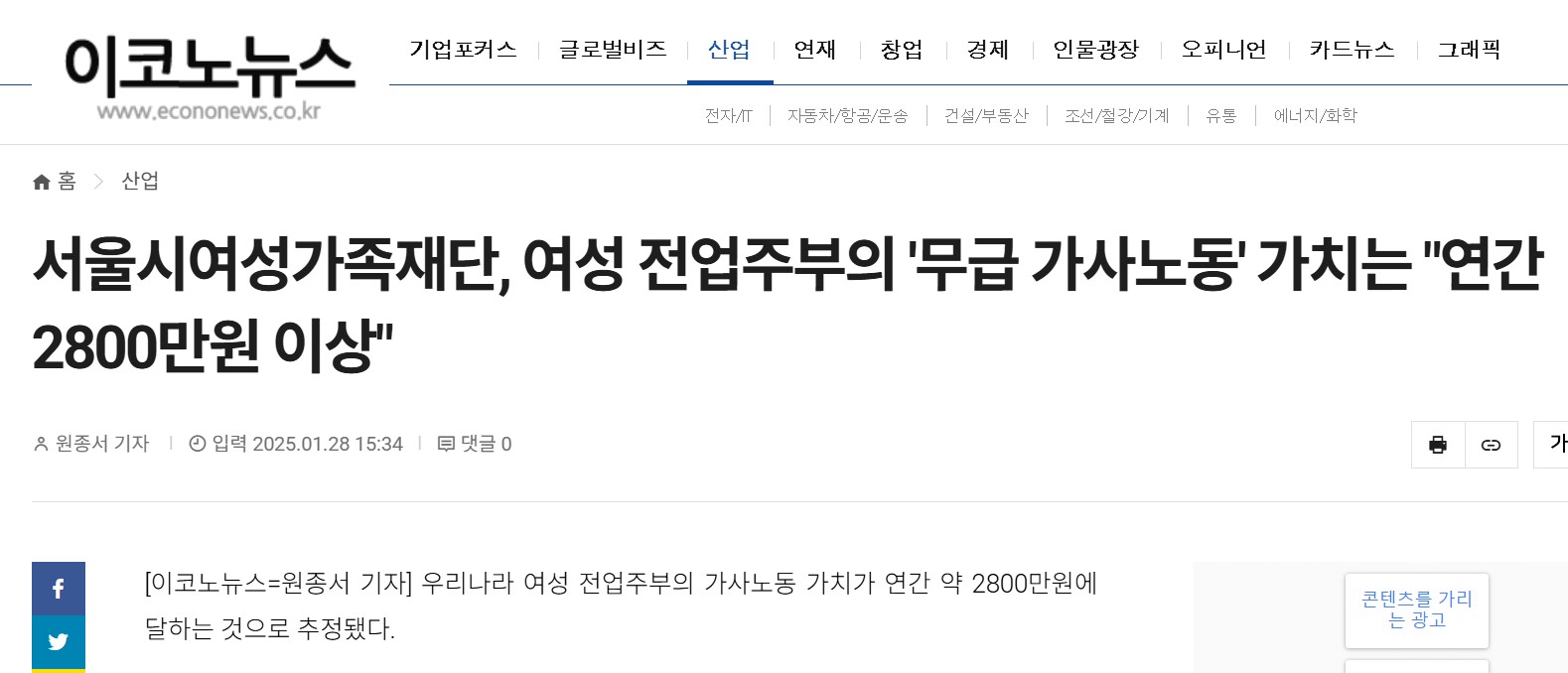 ▶ 서울시 여성가족재단의 보고서에 따르면 기혼 비취업 여성의 무급 가사노동 가치는 연간 약 2,837만 원으로 추정된다고 한다. 하루 평균 7.03시간을 가사노동에 투입하는 것을 기준으로 계산한 수치라고 한다.