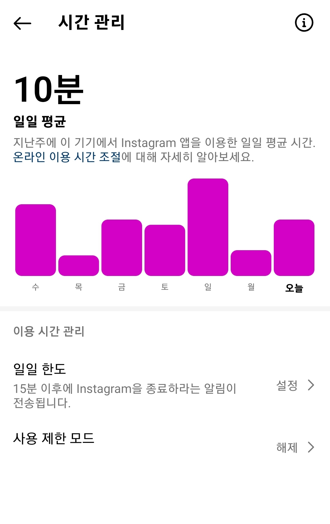 => 이 내용을 듣고 내 인스타그램 사용시간을 보니 다행 일일 10분이긴 하다. 하지만 요즘 유튜브를 많이 봐서 이 부분도 좀 줄여야겠다. 혹시 몰라 사용제한 시간 15분으로 설정 완료!!