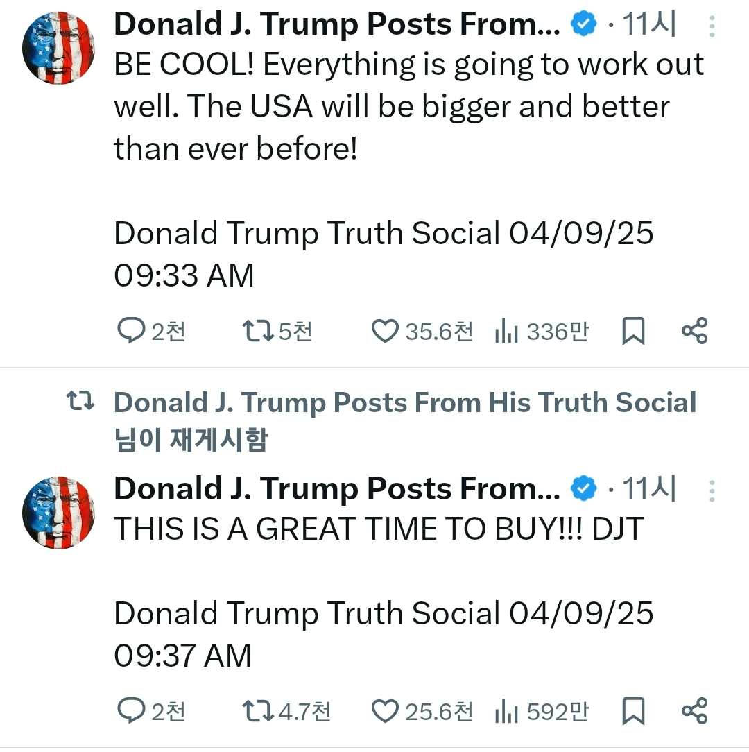 트럼프는 자신의 SNS (X)에 “THIS IS A GREAT TIME TO BUY!!!” 라며 투자 심리를 자극했습니다.