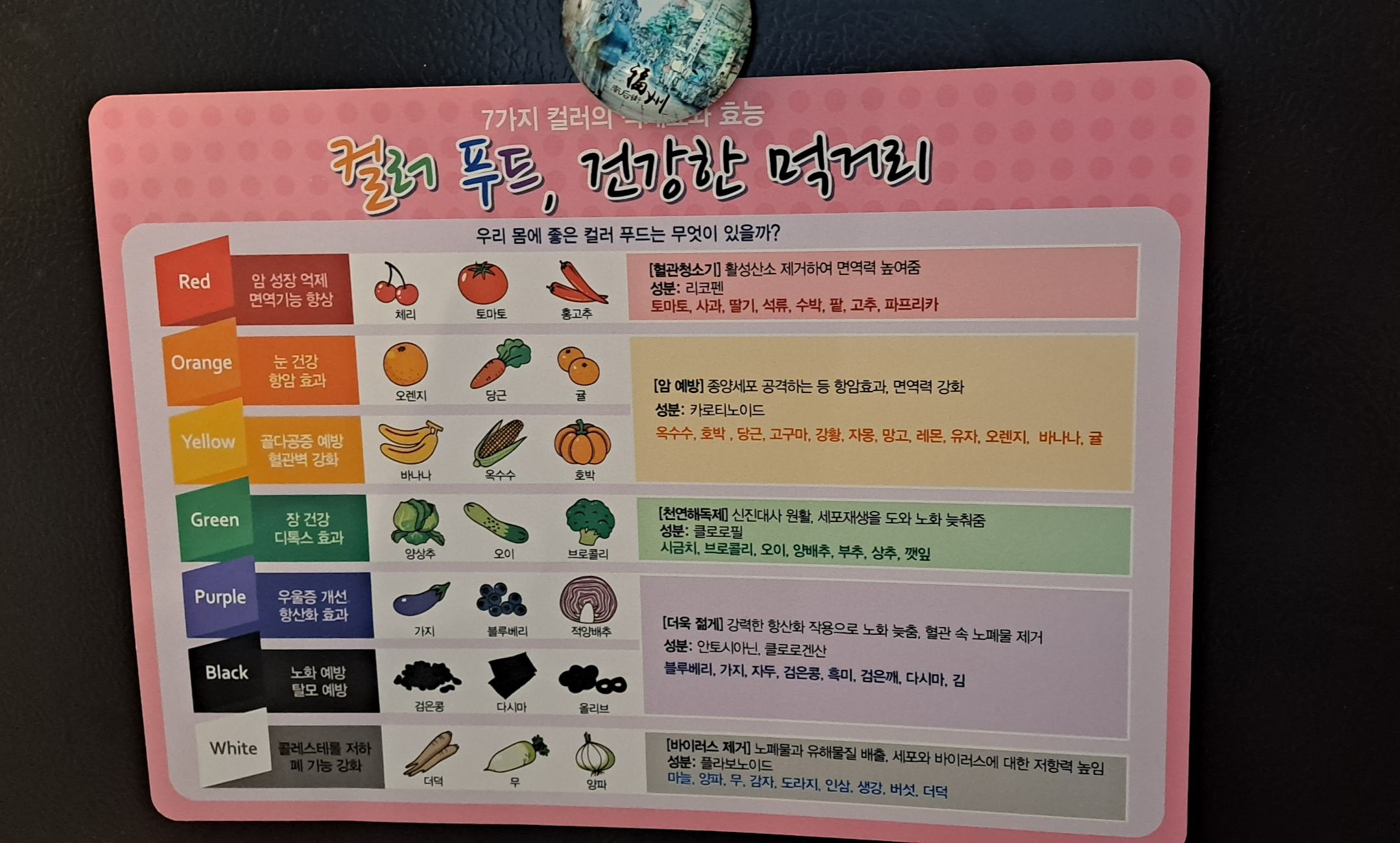 냉장고 사이드에는 식재료별 영양소와 효능을 적어놓은 종이를 붙여 놓았다. 이걸 보면 야채와 좋은 식재료들을 자주 먹어야겠단 생각도 들도 나쁜 음식 (라면이나 인스턴트)도 가능한 멀리하게 되는 인지도 되어 좋은 것 같다.