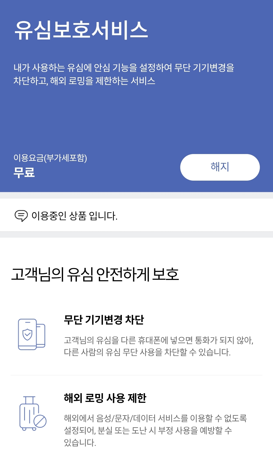 이 서비스에 가입하면, 내 유심이 다른 휴대폰에 꽂혔을 때 통화, 문자, 데이터가 차단되고 해외 로밍 서비스도 제한돼서