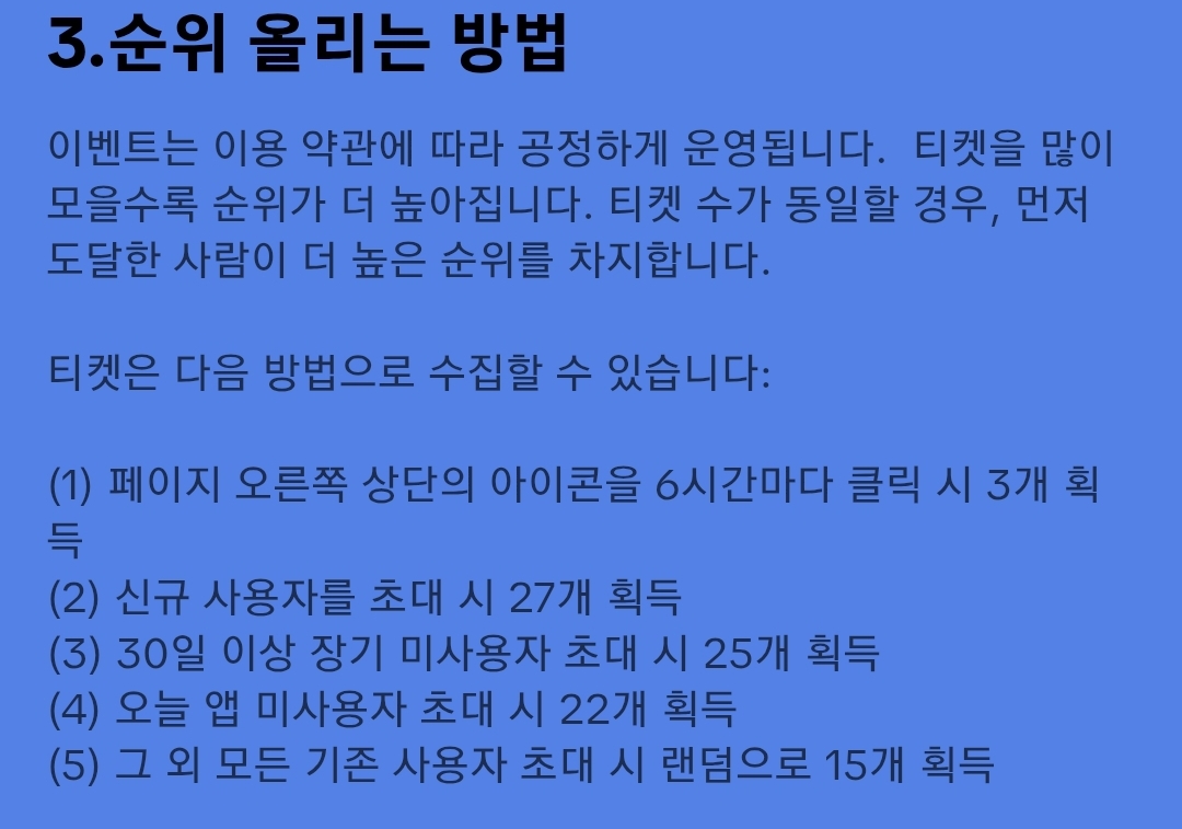 기본적으로 자신의 티켓을 6시간마다 수집해도 50만등 안에는 들고요 주변에 홍보하고 매일 다른사람 꽃까지 정말 열심히 수집하면 10만등 안에 들수있는것 같습니다.