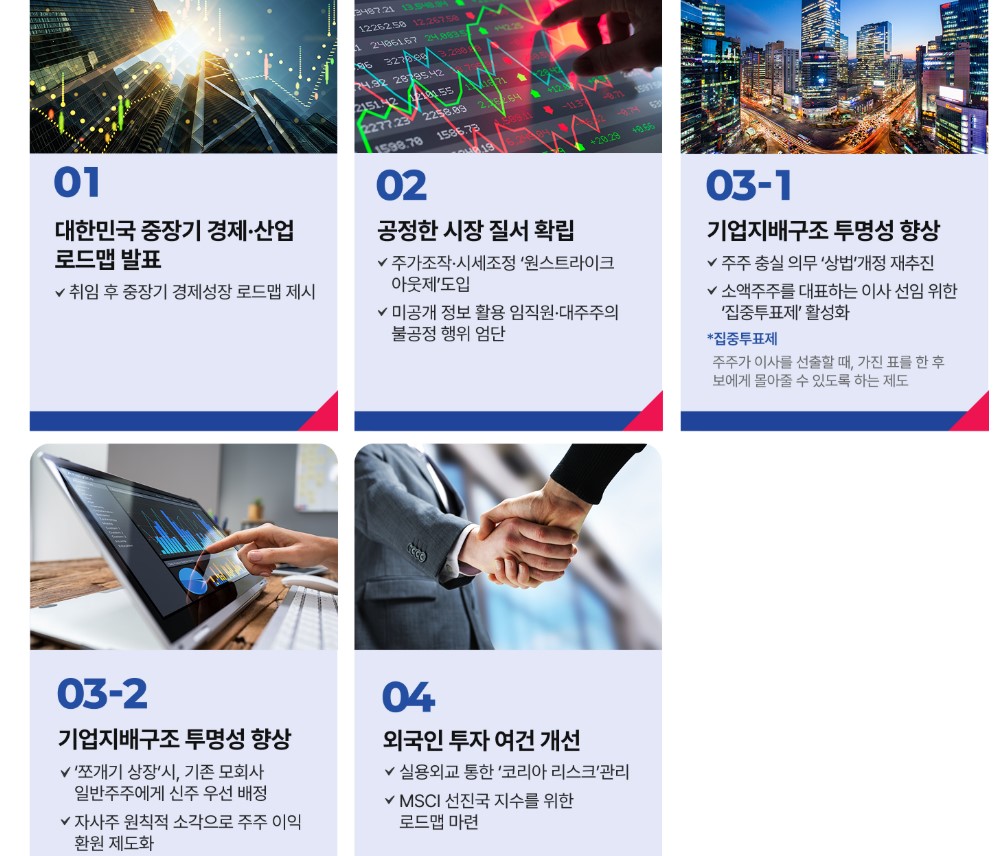 상법 개정 등을 통해 소액주주 보호를 강화하고, 주주들의 이익을 보장하는 제도를 도입할 예정입니다. - 외국인 투자자 유치